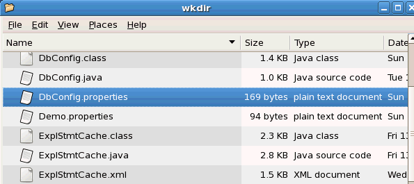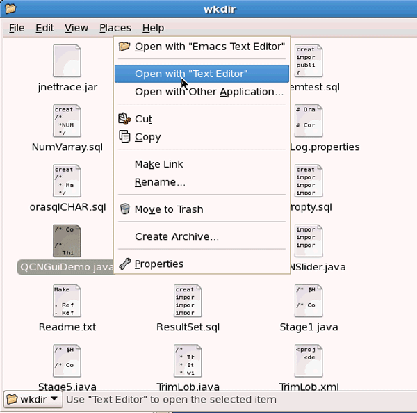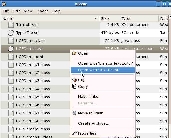Select the UCPDemo.java and DbConfig.properties from the wkdir directory and click Open with "Text Editor".
