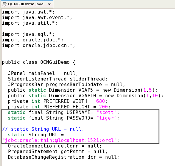 Scroll down a little in the QCNGuiDemo.java file and review the connection URL string information.