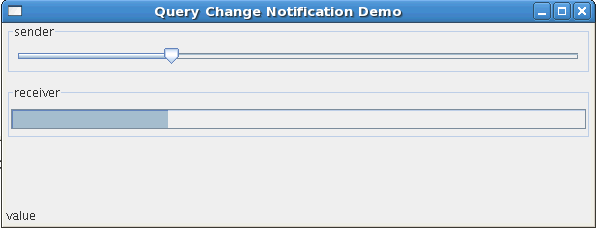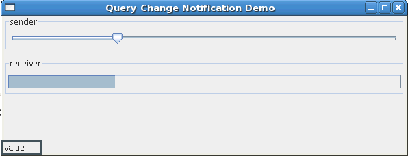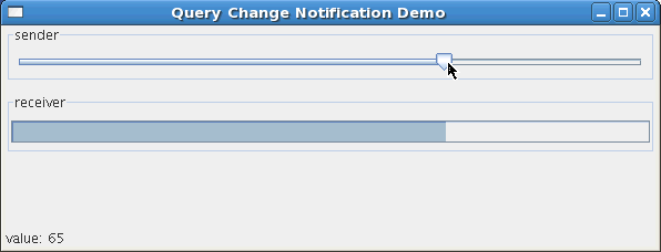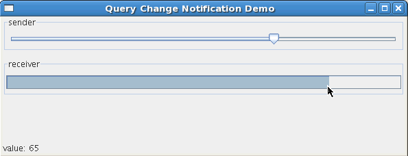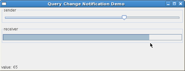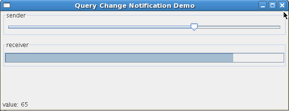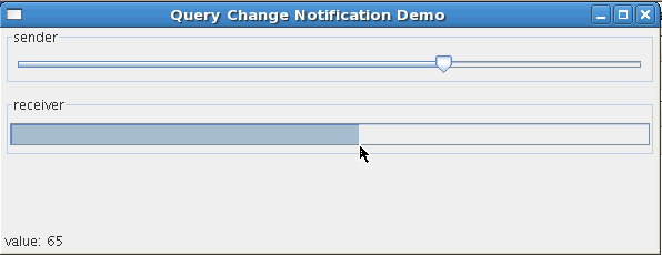 dcr.addListener(list);The program QCNGuiDemo.java creates a GUI with a pair of sliders. When the upper slider is moved, a DML operation, update emp set sal=? where empno =7374, is performed. On occurrence of the database change event, the database server notifies the JDBC driver. The driver then constructs a new Java event, identifies the registration to be notified, and notifies the listeners attached to the registration. QCNSlider handles the change event by moving the bottom progress bar in accordance to the salary of empno=7374.