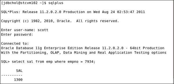Open a terminal window, start a SQL*Plus session (use scott/tiger), and execute the following SQL command: sqlplus