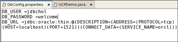 In the file DbConfig.properties, verify the URL, username and password information about your Oracle database DB_USER =jdbchol