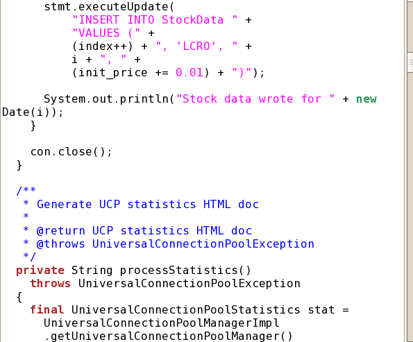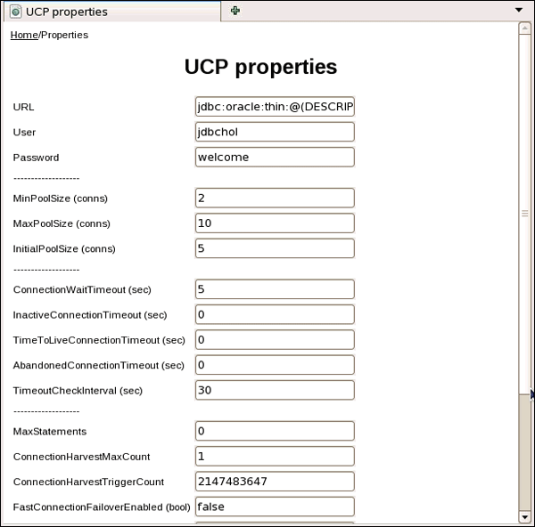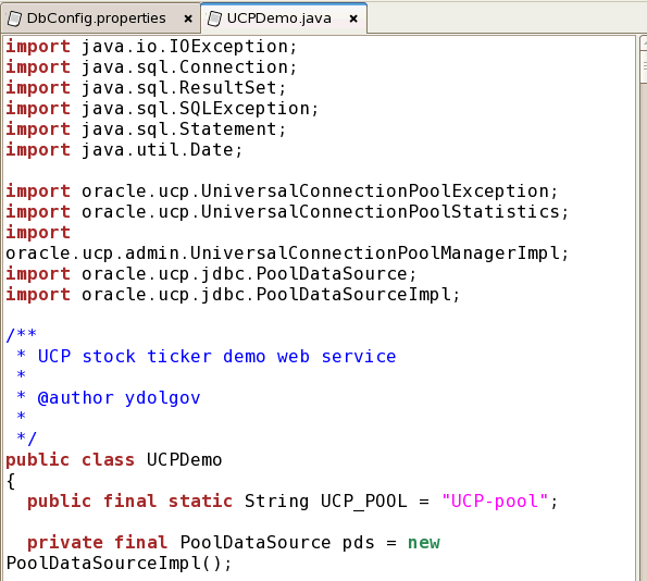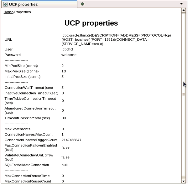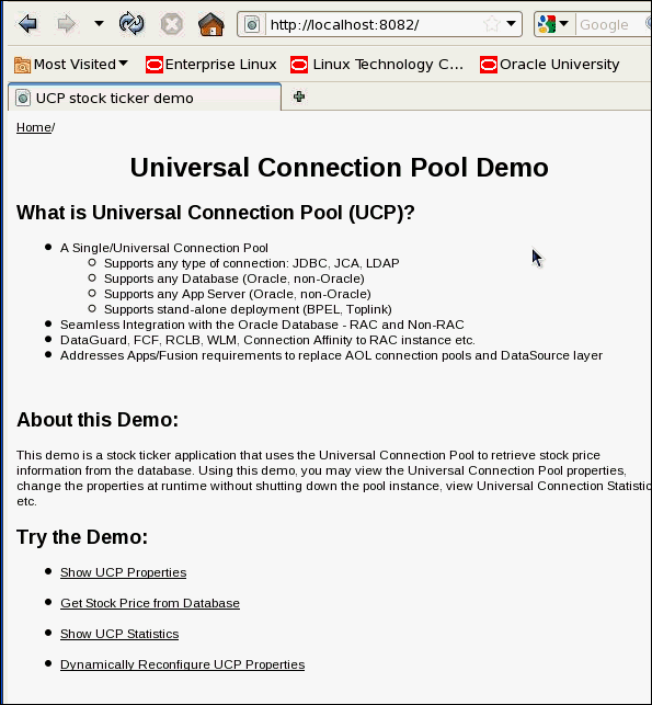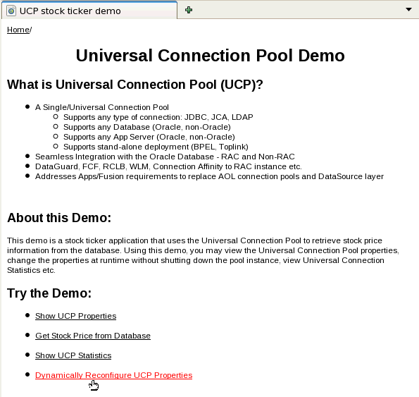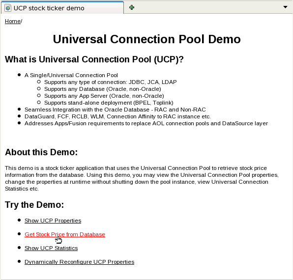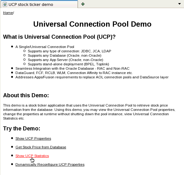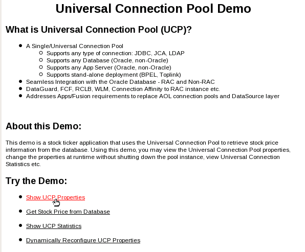 This demo is a stock ticker application that uses the Universal Connection Pool to retrieve stock price information from the database. Using this demo, you may view the Universal Connection Pool properties, change the properties at runtime without shutting down the pool instance, view Universal Connection Statistics etc. To perform this demo execute the following steps: