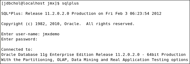 Start SQL*Plus and connect to the jmxdemo user. Use the password jxmdemo.