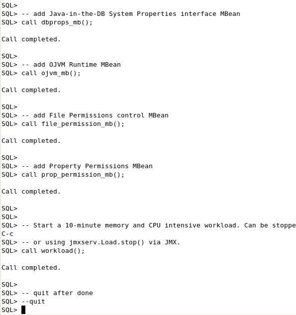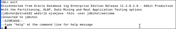 Invoke Java in the Database using ojmjava, which is an interactive command-line utility that can run Java classes in the database from the client machine. The ojmjava uses the JDBC connection to create a database session to pass a byte array from ojmjava client to ojmjava server where the main method of the user class is executed. The ojmjava server then passes the output back to the client. Exit SQL*Plus and from your terminal window, execute the following commands: exit