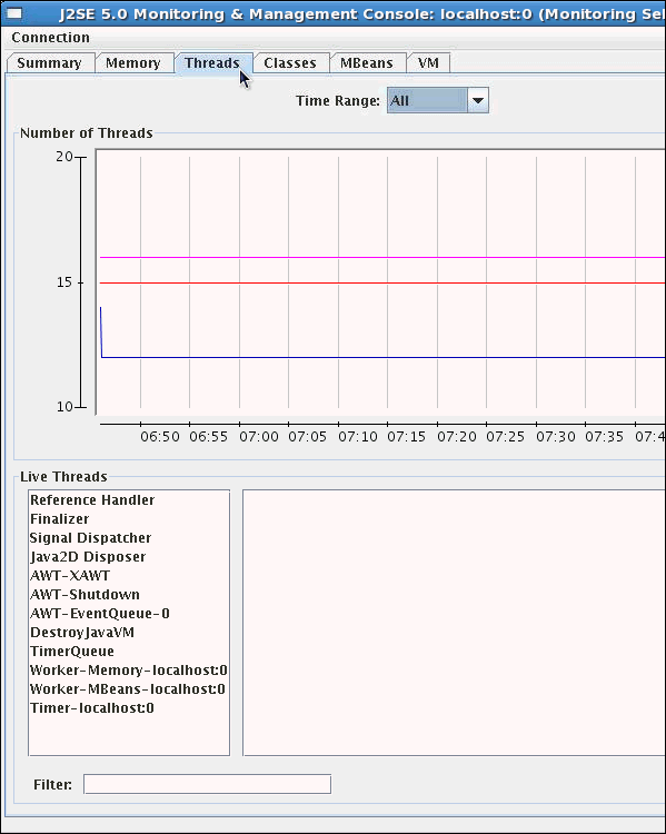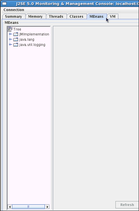 You can use the MBeans tab to monitor and manage MBeans. This tab displays information on all the MBeans registered with the platform MBean server.