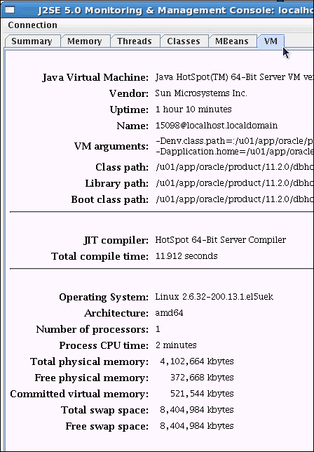 You can use JConsole, a Sun JMX client tool, for monitoring and controlling Oracle JVM. To monitor Oracle JVM with JConsole perform the following steps: