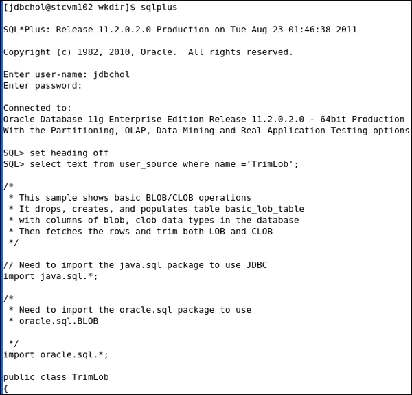 Start SQL*Plus and connect as jdbchol/welcome. To verify that the TrimLob.java routine is loaded into the database, start SQL*Plus from your terminal window and execute the following statements: set heading off