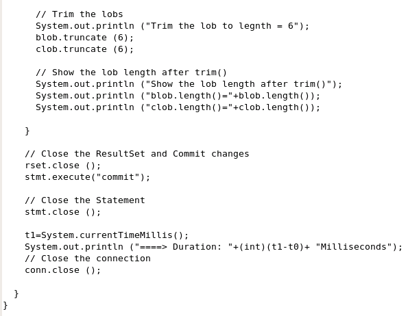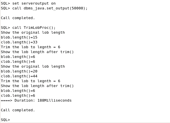 Using the following steps, load the TrimLoad.java routine into the database using the default server-side connection (conn = DriverManager.getConnection("jdbc:default:connection:");) and then execute it by calling it from the PL/SQL TrimLobProc procedure: