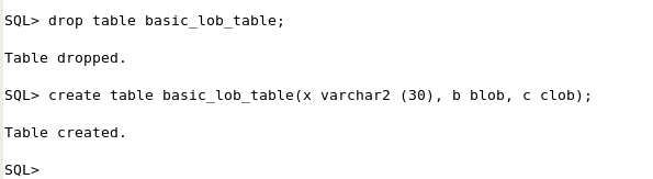 Execute the following commands to create a table (and remove the table if it existed previously). This table is used by the stored TrimLob java routine to manipulate LOB data: drop table basic_lob_table;