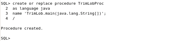 Publish the Java class method by creating the TrimLobProc PL/SQL Call specification that references the Java class methods. Within the TrimLobProc PL/SQL specification, you identify the name of the Java class method and its parameters. This is called "Publishing" the Java class method. create or replace procedure TrimLobProcas language java name 'TrimLob.main(java.lang.String[])'; /