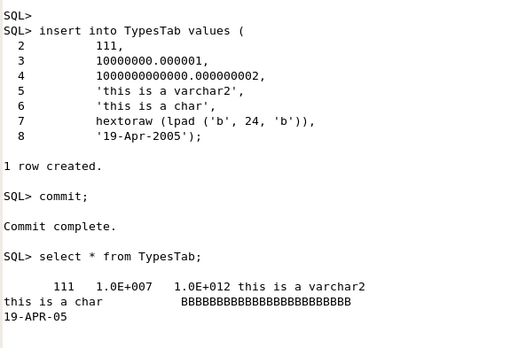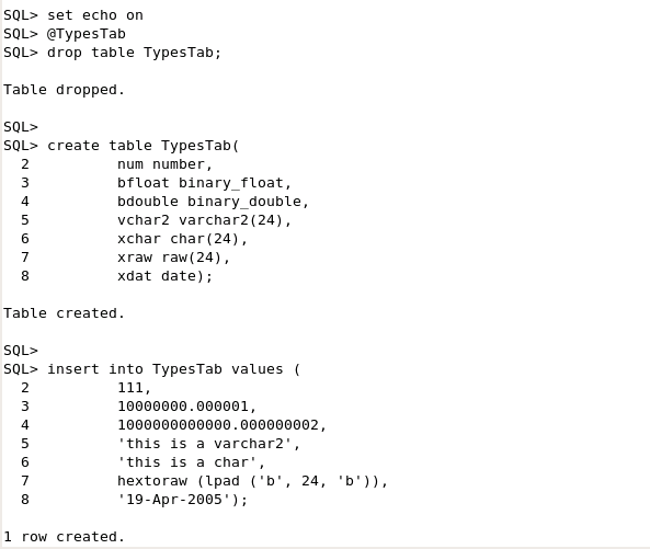 Execute the TypesTab.sql and orasqlCHAR.sql scripts. The TypesTab.sql script creates a table that holds several different Oracle data types. The orasqlCHAR.sql script creates the mapping between the oracle.sql.CHAR data type to the SQL CHAR data type. set