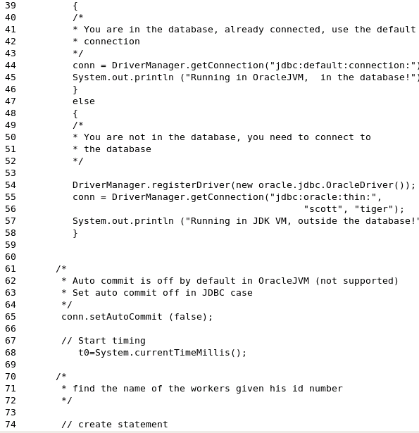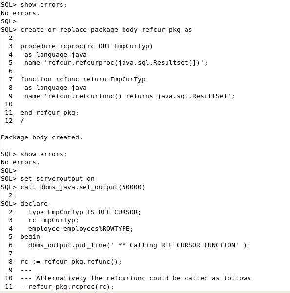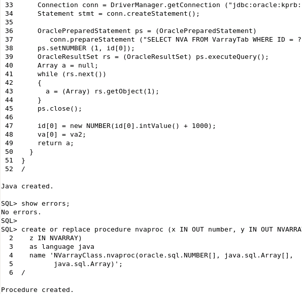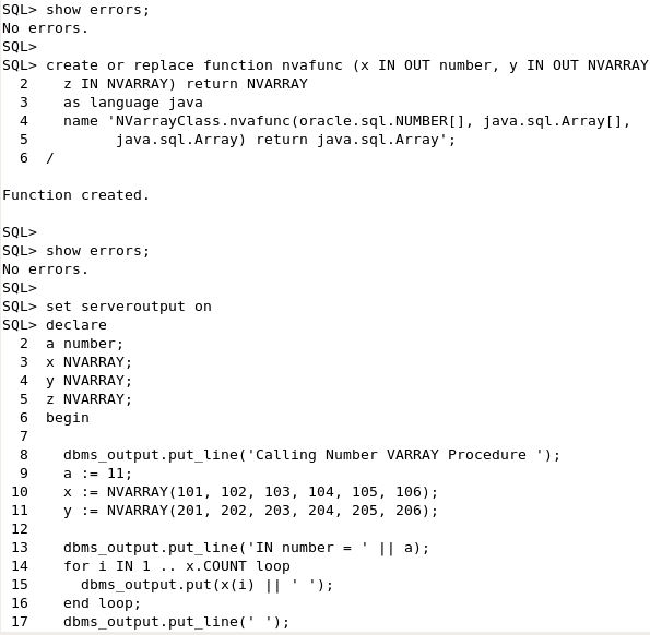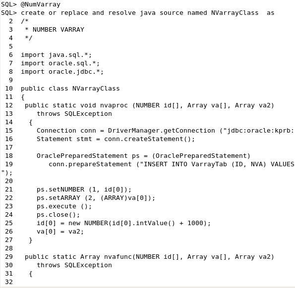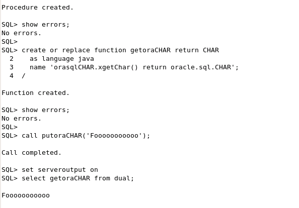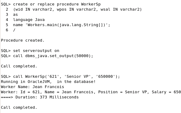 You can also invoke Java in Database through your SQL*Plus session using a PL/SQL wrapper that identifies the Java class and its parameters. From your terminal window, start SQL*Plus (use jdbchol/welcome for the user-name and password), then create the PL/SQL wrapper using the code shown below: sqlplus