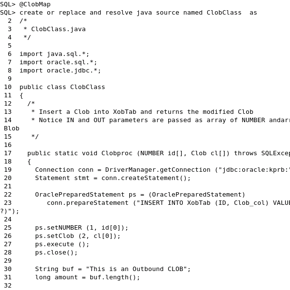 Map the CLOB locator to/from java.sql.Clob by executing the ClobMap.sql script: @ClobMap