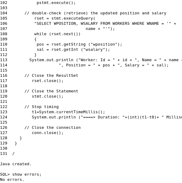 Execute the Workers.java script to create and store a Workers java class method in the database. @Workers.java