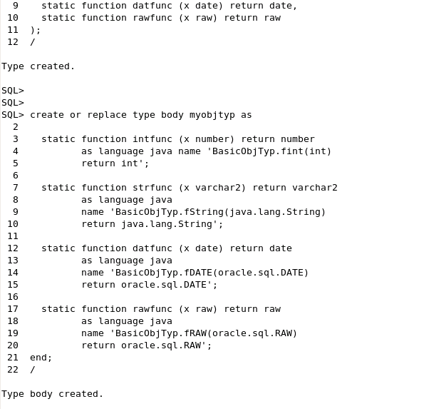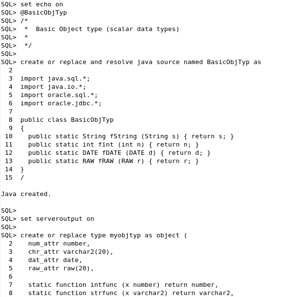 Invoke Java in database through using the PL/SQL wrapper. In SQL*plus, execute the BasicObjTyp.sql script: set