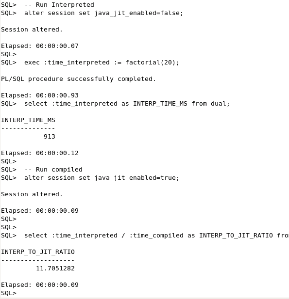 From your SQL*Plus session, execute the JITDemo.sql script: @JITDemo Notice the timing ratio between interpreted and compiled code