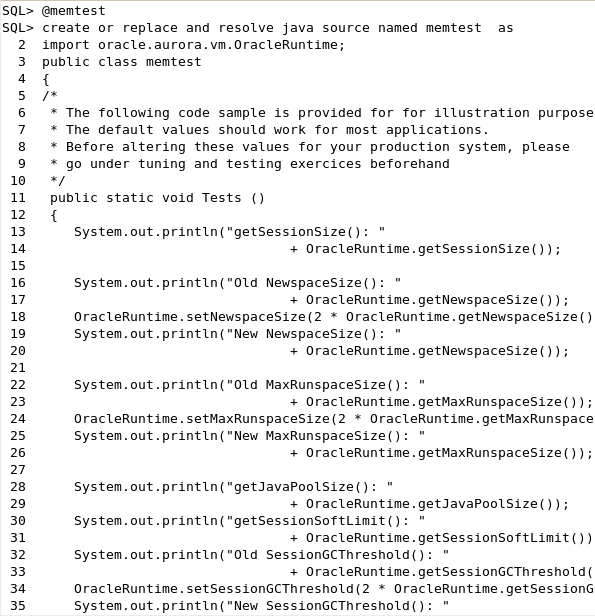 In OracleJVM the states of Java objects, used for specific needs, are preserved in various specific memory ares (such as Newspace, Oldspace, Runspace, Stackspace, Sessionspace) called "object memories". Perform the following step to display various Java memory areas
