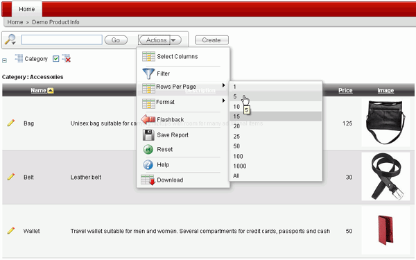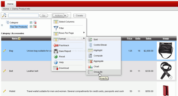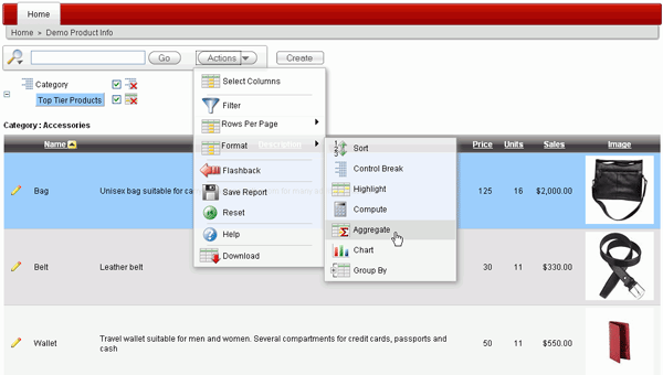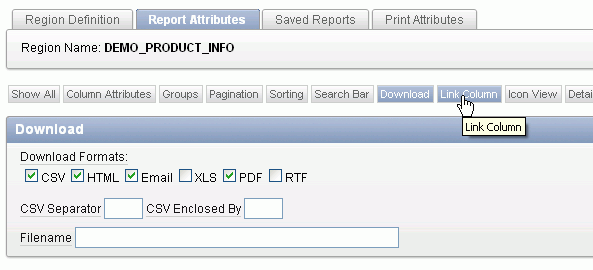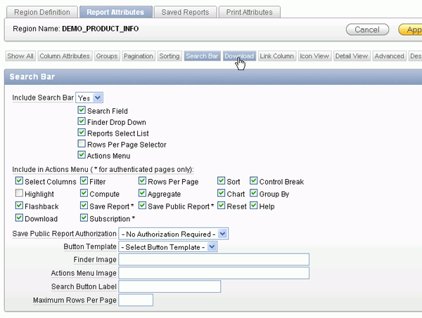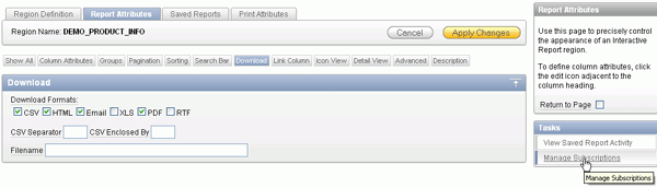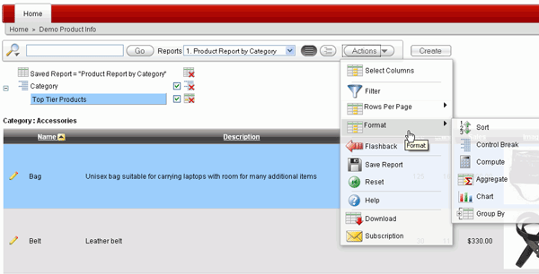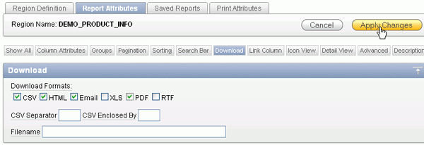 Interactive Reporting Regions enable end users to customize reports. Users can alter the layout of report data by choosing the columns they are interested in, applying filters, highlighting, and sorting. They can also define breaks, aggregations, different charts, and their own computations. Users can create multiple variations of the report and save them as named reports and download to various file formats including comma-delimited file (CSV) format, Microsoft Excel (XLS) format, Adobe Portable Document Format (PDF), and Microsoft Word Rich Text Format (RTF). For further information, click on help and search on Interactive Reports.