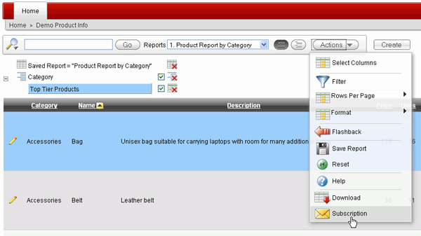 To set up an automatic email of the report to be sent on a scheduled basis, select Subscription from the Actions menu.