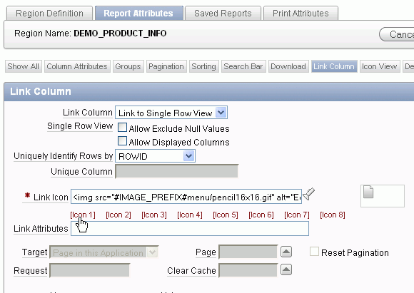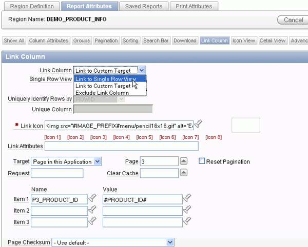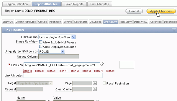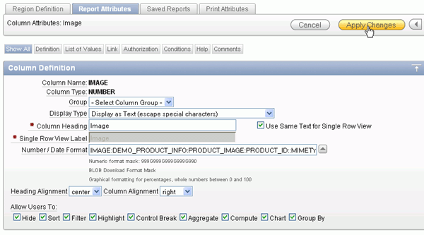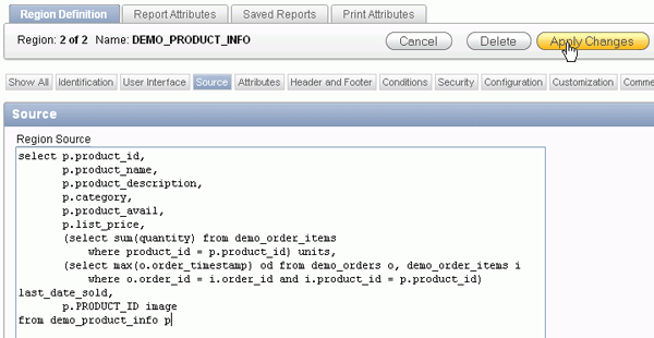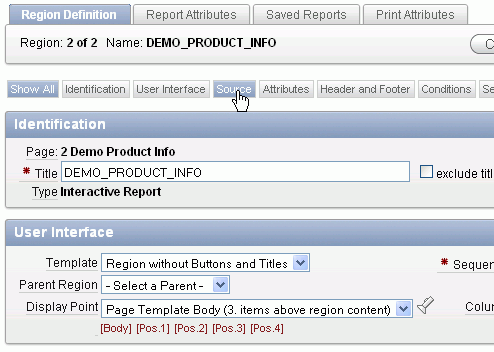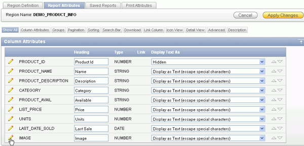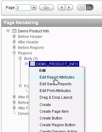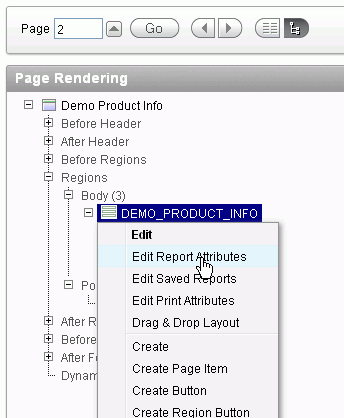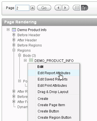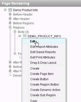 You also want to make some changes to the Report Attributes. Under Regions > Body, right-click DEMO_PRODUCT_INFO and select Edit Report Attributes.