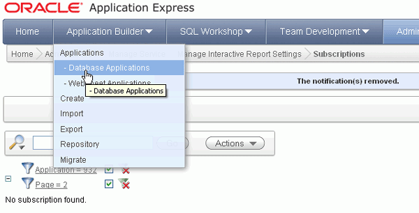 Your subscription was removed. You want to return to your application. Select Application Builder > Database Applications.