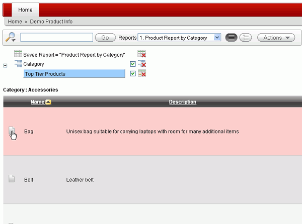 The Home page is displayed, Select the Demo Product Info link to view the report.