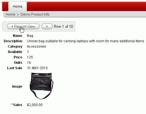 The single row view is displayed. You can display the next row by clicking the > icon or click Report View to return to the report.