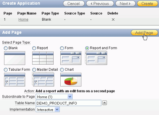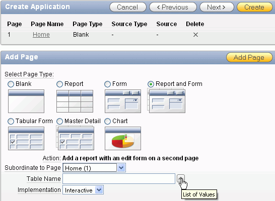 Select Report and Form for Page Type, select Home (1) for Subordinate to Page, make sure Implementation is set to Interactive. Click the up arrow to select a table.