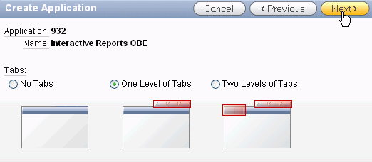 Accept the default to create One Level of Tabs and click Next.