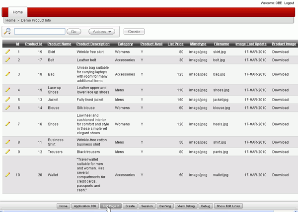 The Report is displayed. Notice that the date format is set according to the date you specified when you created the application. In the next section, you examine some of the Interactive Report features. Click the Edit Page link in the developer toolbar.