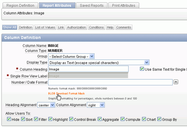 You need to define the way in which the blob will be displayed in the report. Select the BLOB Download Format Mask link under the Number / Date Format field.