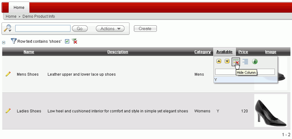 To hide a column, you can select the column header link and then click the hide column icon. Alternatively, from the Actions pull down, you can select Selected Columns and move the column to the Do Not Display area. Select the Available header and click the Hide icon.