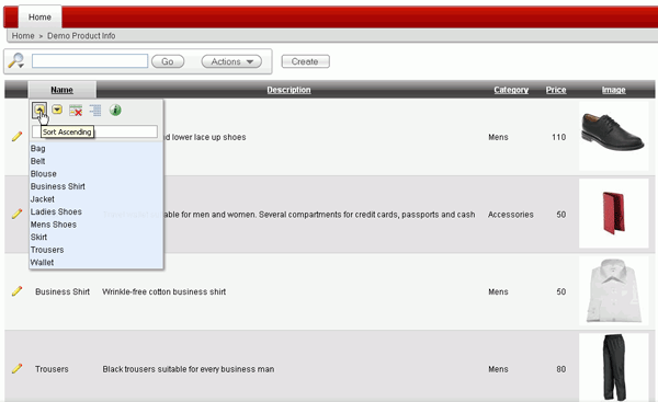 To sort on a column, click the header you want to sort on and select the Sort Ascending or Sort Descending icon. Select the Name column and click the Sort Ascending icon. Alternatively, from the Actions menu, you can select Format > Sort and select multiple sort levels.