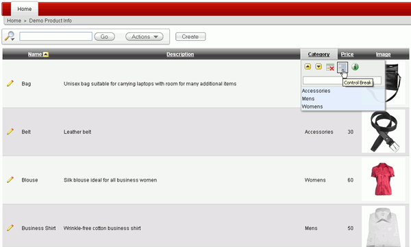 You can create a control break on a column. Select the Category header and select the Control Break icon. Alternatively, from the Actions menu, select Format > Control Break.