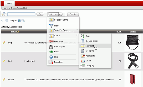 You can also highlight a particular cell or row in the report based on some criteria. Click the Actions menu and select Format > Highlight.