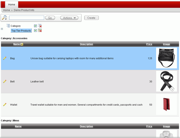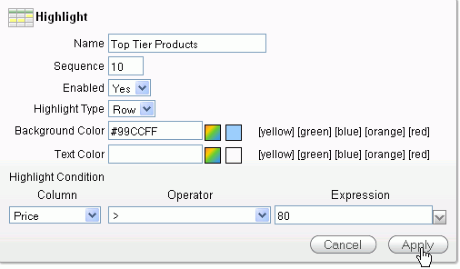 You want to highlight the row of a product if its price is higher than $80. Enter Top Tier Products for the Name, make sure Enabled is set to Yes, Highlight Type is set to Row and select [blue] for Background color. Under Highlight Condition, select Price for the Column, select > for the Operator and 80 for the Expression and click Apply.