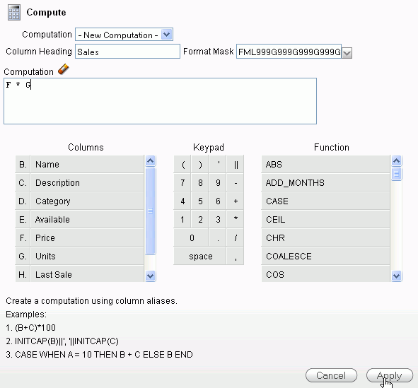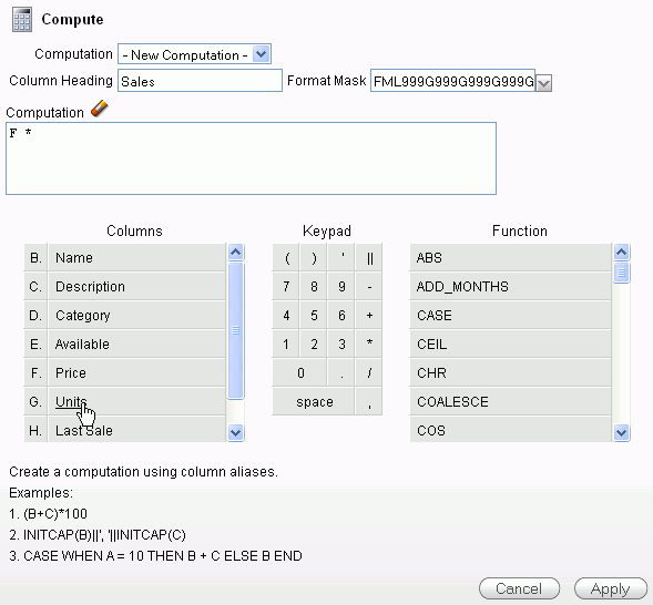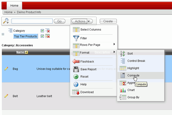 You can create a computed column. In this case, you will create a column to show the sales for each product. Click the Actions menu and then select Format > Compute.