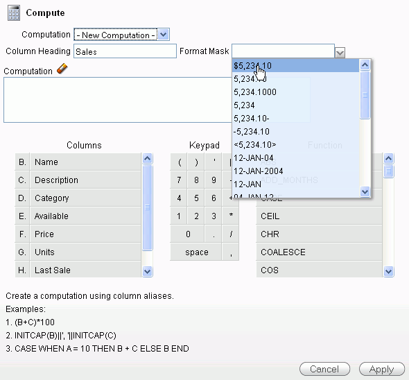 Enter Sales for Column Heading and select $5,234.10 for the Format Mask from the drop down list.