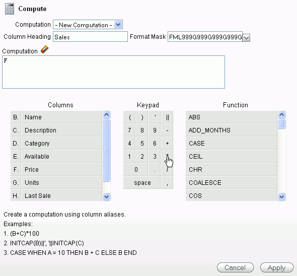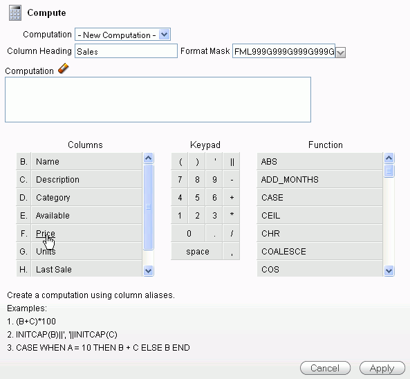 From the list of Columns, select Price. Notice that the letter corresponding to the column appears in the computation area. This is the column alias.