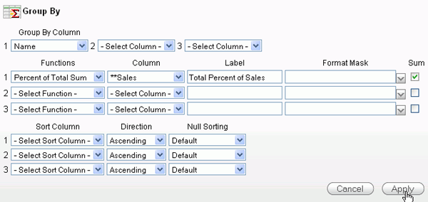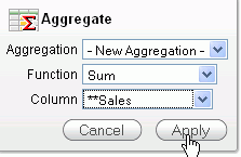 You want to total the Sales column. Select Sum for the Function and **Sales (the ** indicates that the column is a computed column) for the Column. Then click Apply.