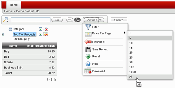 The Group By Report is displayed. It shows the Total Percent of Sales for each Product. Notice that it only displays 5 rows in the report. You want to change this setting to show all. From the Actions menu, select Rows Per Page and select All.