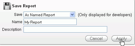 Enter My Report for the Name and click Apply. Note: Save as Named Report is available to all authenticated end users (when saving reports is enabled for the region). The report settings are displayed as a tab above the report, with the name you provide, and is visible *only* for the APP_USER who saved it. Save as Default Report Settings is only available to developers. These settings are applied to anyone who comes to the page for the first time in a session.