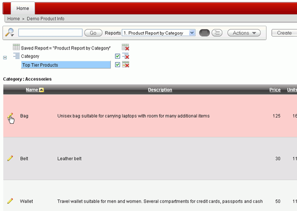 The form is displayed. This form allows you to change the values for this product. You may not want to allow people to change the product information. In this case, you can exclude the column that allows you to view this form from the report. Click Cancel.