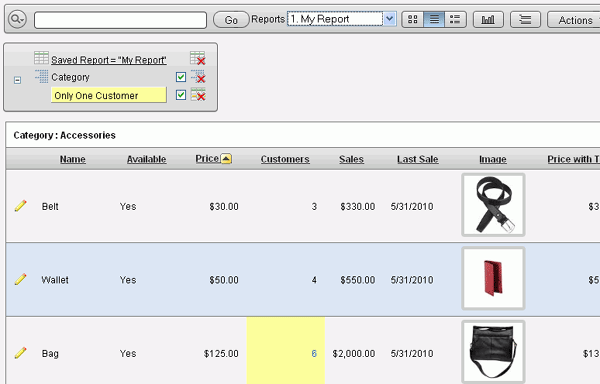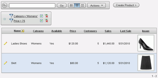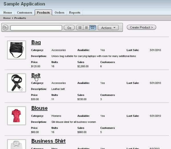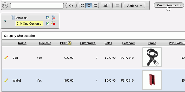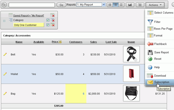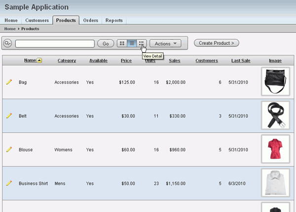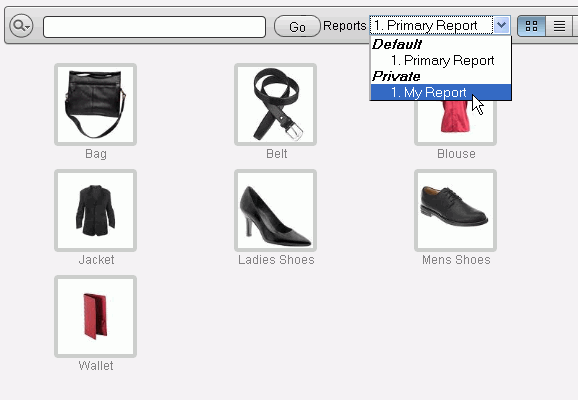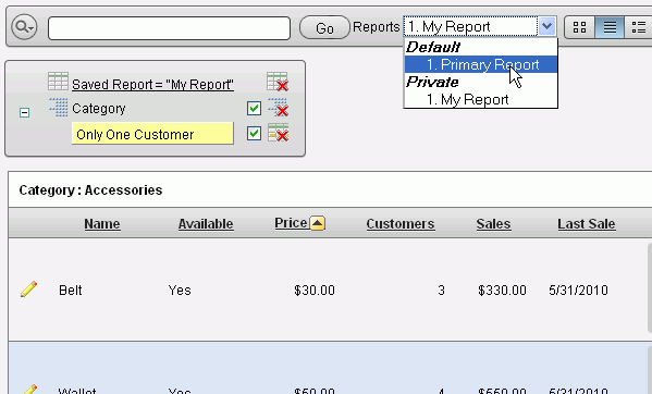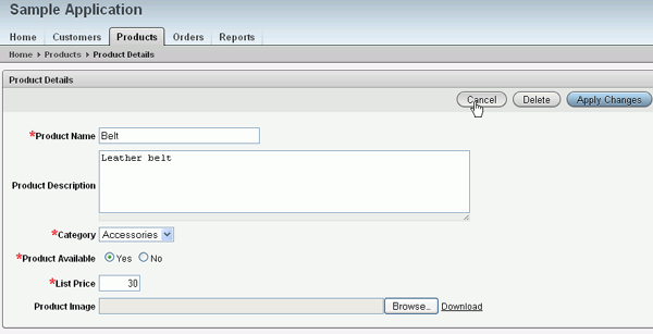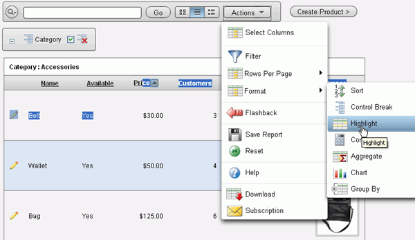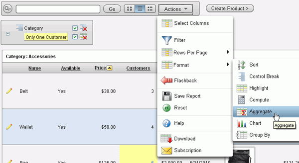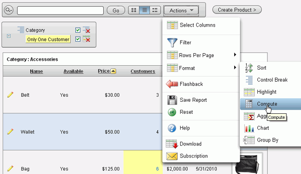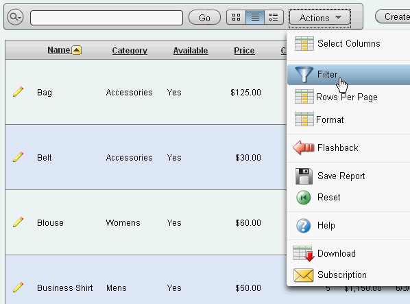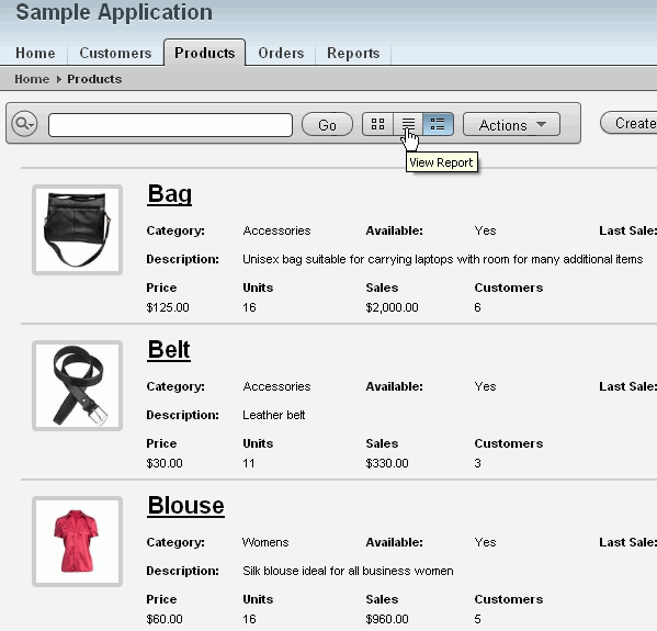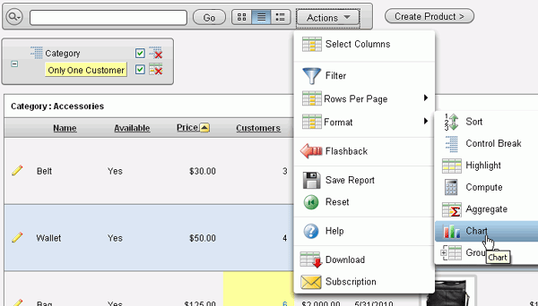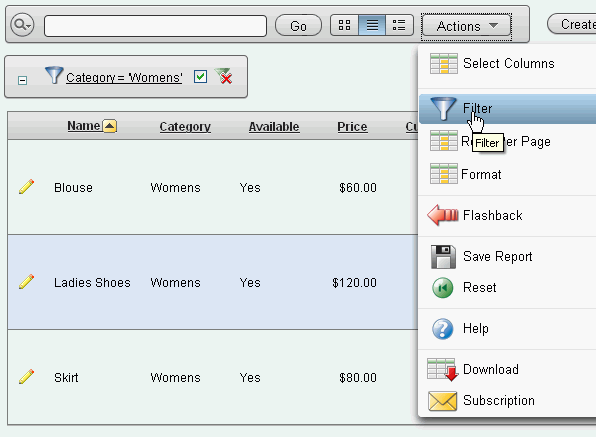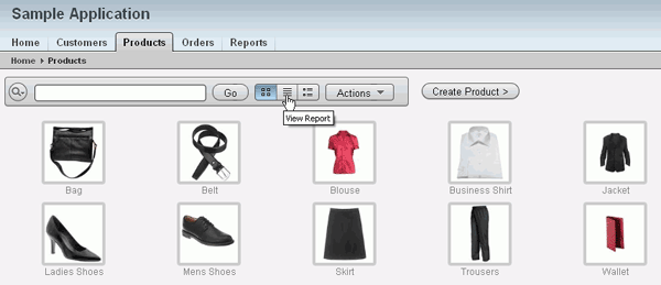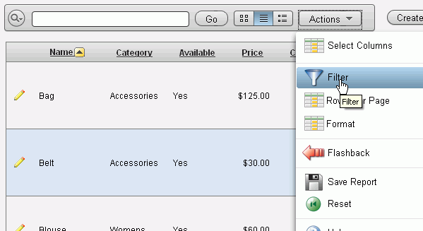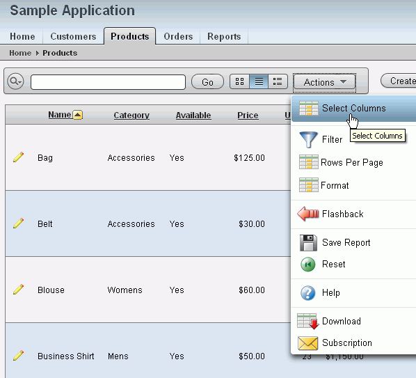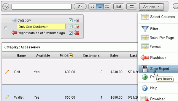 This action is used to save the customized report for future use. You provide a name and an optional description. When navigating between pages in an application and then returning to the Products tab, your changes (filters, control breaks, etc.) will still be available. In APEX 4.1, you can save a report as a Public Report so that other authenticated users can see the report. You can also save Private Reports that only you may view. If you logout, your changes will not be saved unless you have saved the report. You can save multiple versions of a private or public report and each will appear in the list of reports. Perform the following steps: