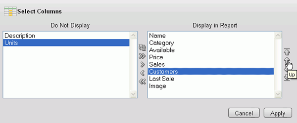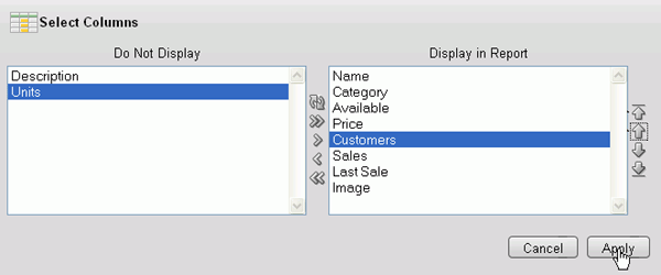 To hide columns from the report display, select the Units column and click < to move the column to the Do Not Display area.