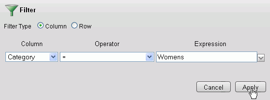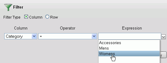 Select Womens from the list of expressions. Notice that this list of values is determined automatically based on all the values in the Category column. The list of expressions can show up to 500 unique values.