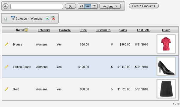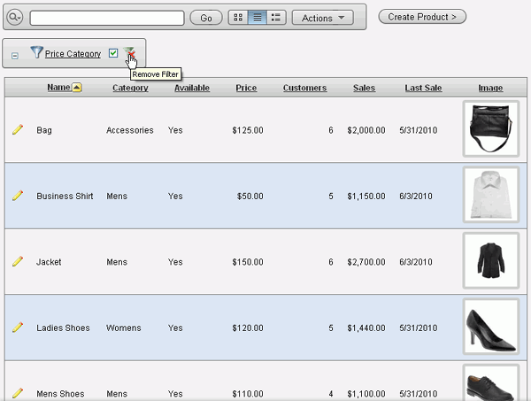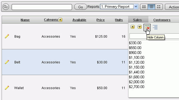Notice that the Sales column no longer appears in the report. Note: To get the column back, use the Select Columns option from the Actions menu.