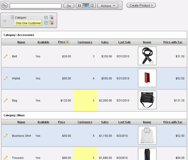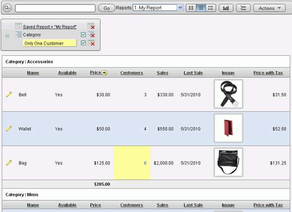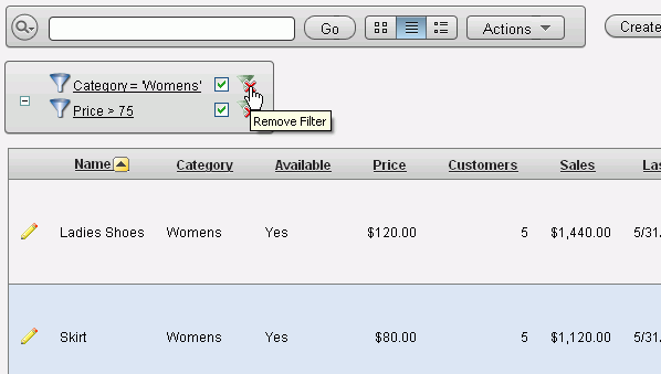 The Price Category filter is applied. You only see rows that are either the Mens category or the price is over $80.
