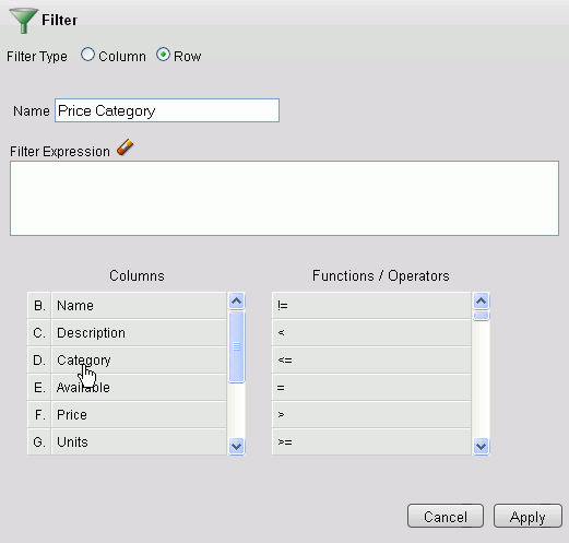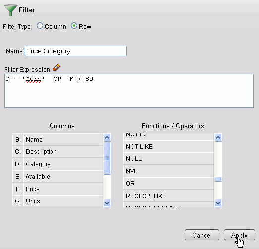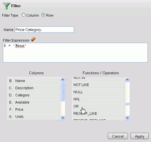 You want to create a filter where the row will be selected if the Category is Mens OR the price is greater than $80. Select the Row filter type, enter Price Category for Name and under the list of Columns, select Category.