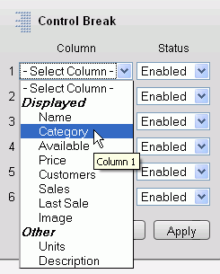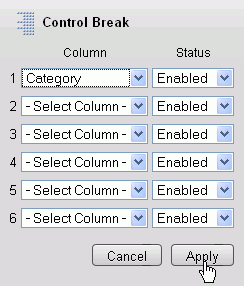 You want to create a control break on Category. From the Column drop-down list select Category.